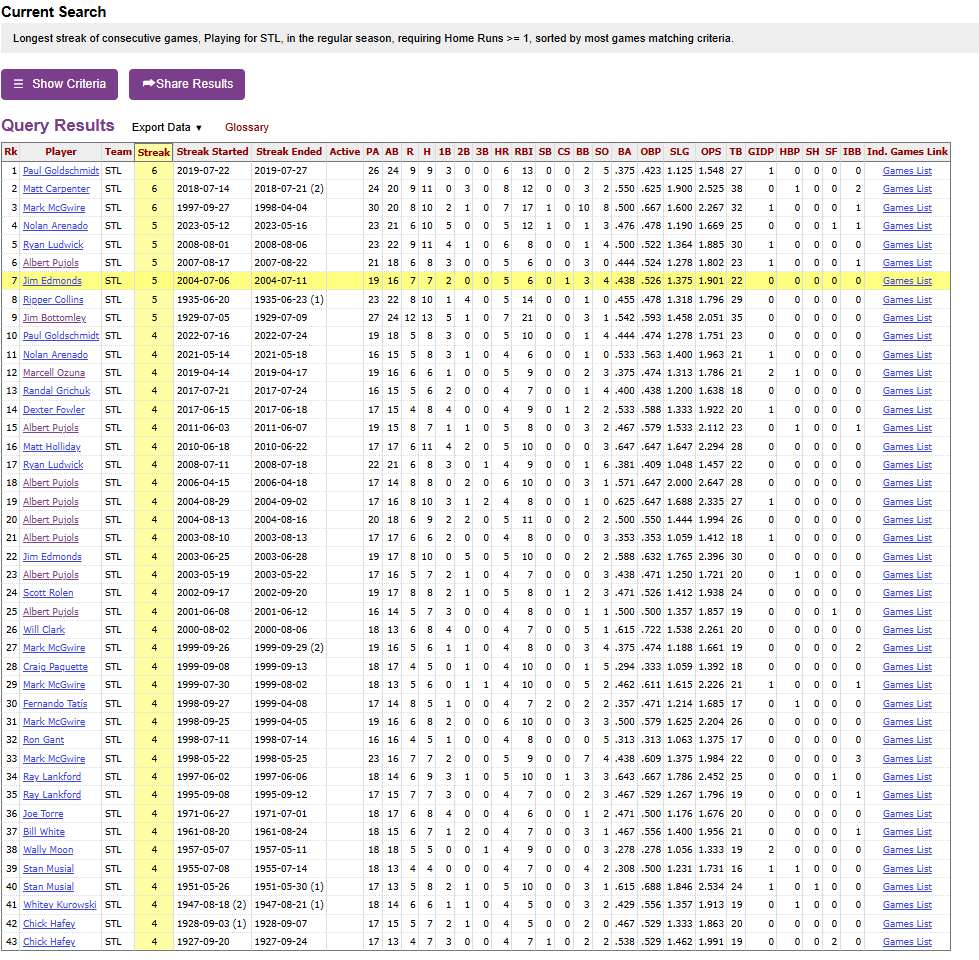 As much as I pride myself on my trivia - especially Cardinal trivia - I made a blunder yesterday on Twitter. In the excitement of Jordan’s Walker’s third home run in as many games, I tweeted that only Musial and Pujols had hit home runs in four straight games as Cardinals. Anathema.